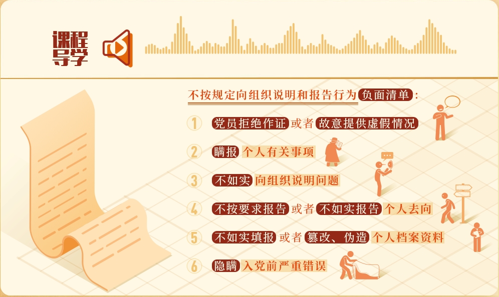 《中國共產(chǎn)黨紀律處分條例》第八十條、八十一條,對不按規(guī)定向組織說明和報告行為作出了處分規(guī)定,主要包括6類:
