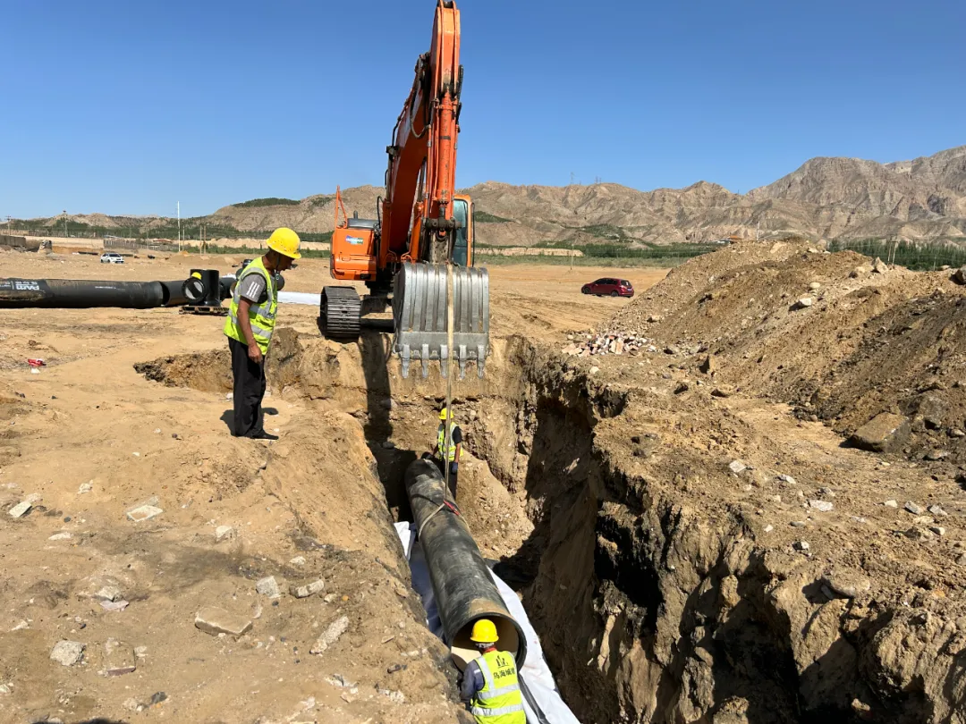 近日,記者在海勃灣區(qū)的南部?jī)羲畯S輸水管道項(xiàng)目現(xiàn)場(chǎng)看到,隨著挖掘機(jī)緩緩升起,一根長(zhǎng)約6米的給水管被緩慢放進(jìn)坑道。隨后施工