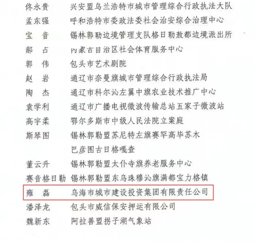 烏海市城投集團(tuán)雍磊同志獲得內(nèi)蒙古自治區(qū)2024年度“最美退役軍人”榮譽(yù)稱號