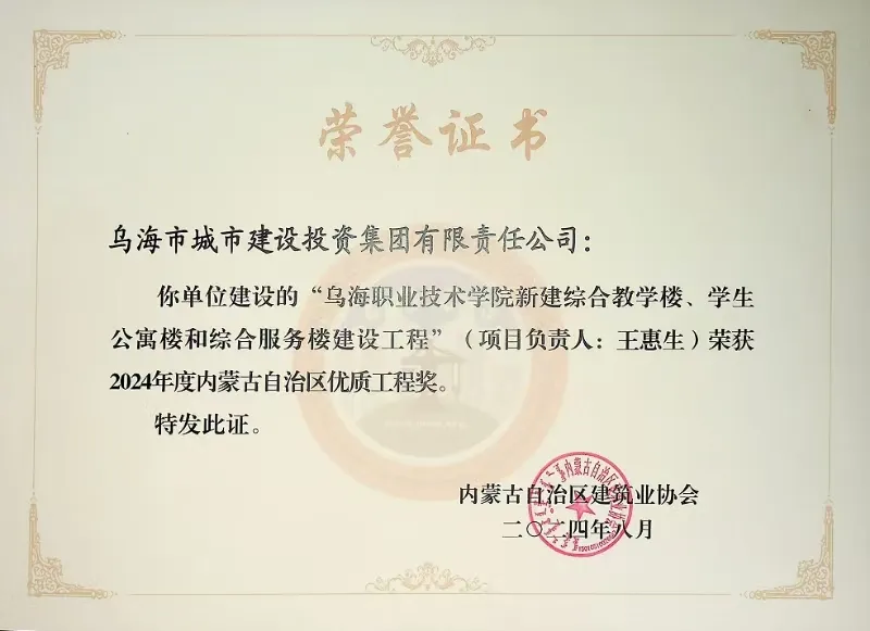 近日,經(jīng)內(nèi)蒙古自治區(qū)建筑業(yè)協(xié)會與房地產(chǎn)業(yè)協(xié)會的專家共同評審,由烏海市城建投融資有限責(zé)任公司負責(zé)承建的烏海職業(yè)技術(shù)學(xué)院新建綜合教學(xué)樓、學(xué)生公寓樓及綜合服務(wù)樓建設(shè)工程,榮獲“2024年度內(nèi)蒙古自治區(qū)建筑工程優(yōu)質(zhì)工程獎”。