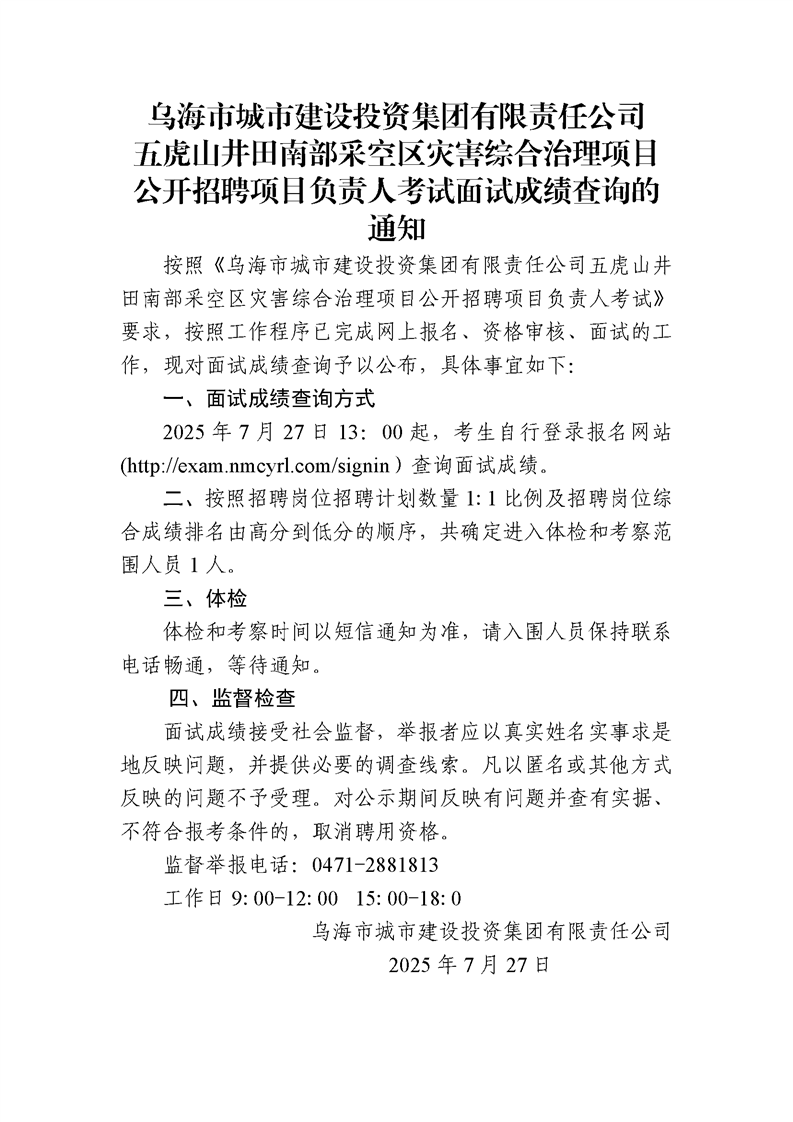 烏海市城市建設(shè)投資集團(tuán)有限責(zé)任公司五虎山井田南部采空區(qū)災(zāi)害綜合治理項目公開招聘項目負(fù)責(zé)人考試面試成績查詢的通知