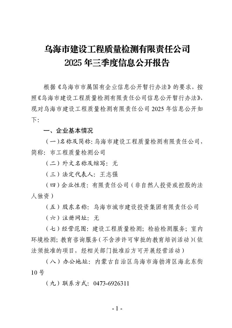 烏海市建設(shè)工程質(zhì)量檢測(cè)有限責(zé)任公司2025年三季度信息公開(kāi)