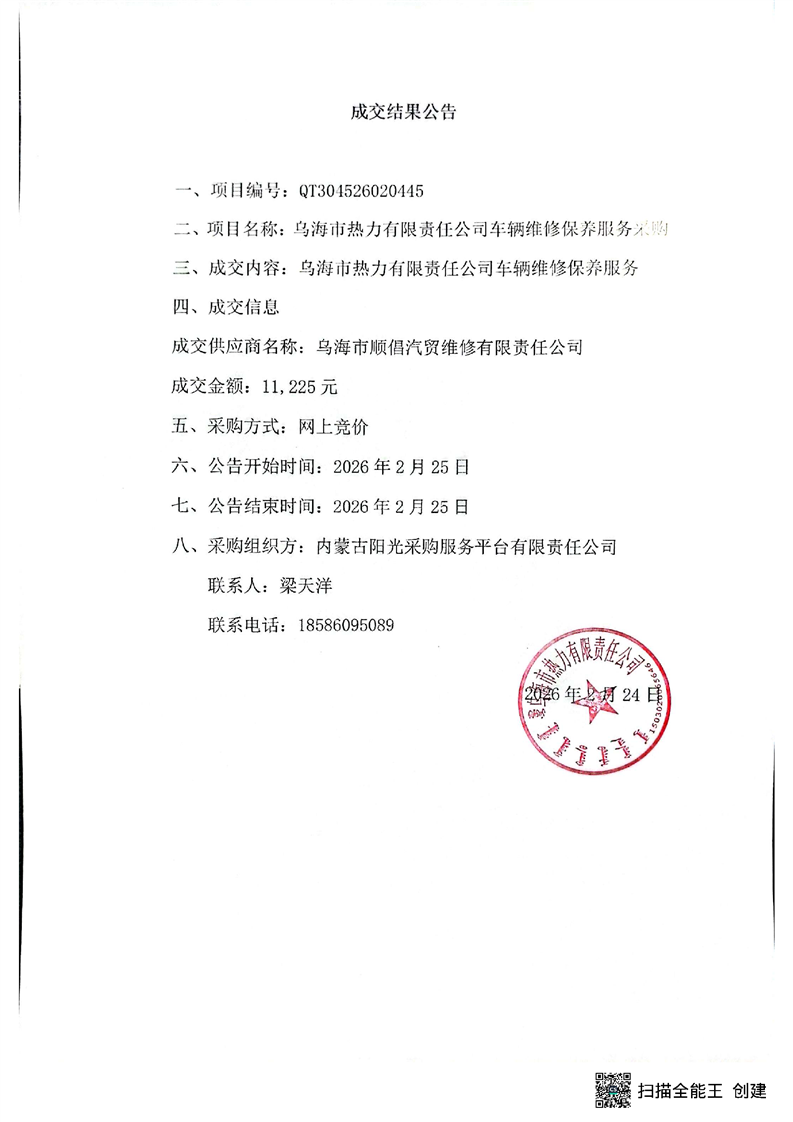 烏海市熱力有限責(zé)任公司車輛維修保養(yǎng)服務(wù)采購成交結(jié)果公告