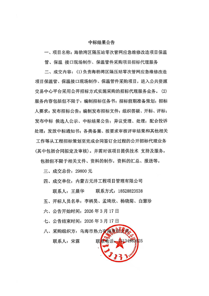 海勃灣區(qū)隔壓站零次管網(wǎng)應(yīng)急維修改造項(xiàng)目保溫管、保溫 接口現(xiàn)場(chǎng)制作、保溫管件采購(gòu)項(xiàng)目招標(biāo)代理服務(wù)(結(jié)果公告)